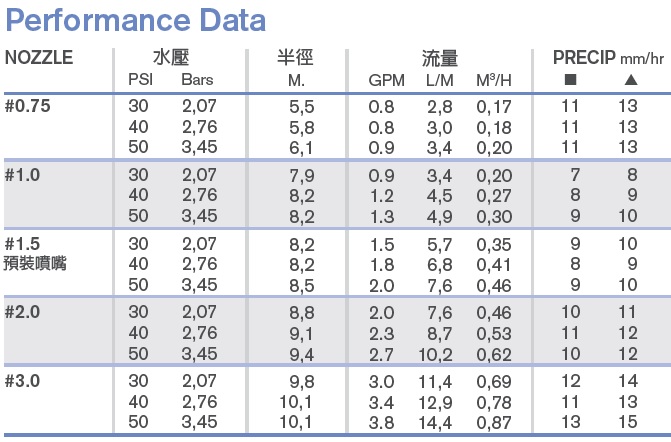 噴灑半徑:5.5 - 10公尺(依據使用噴嘴規格)