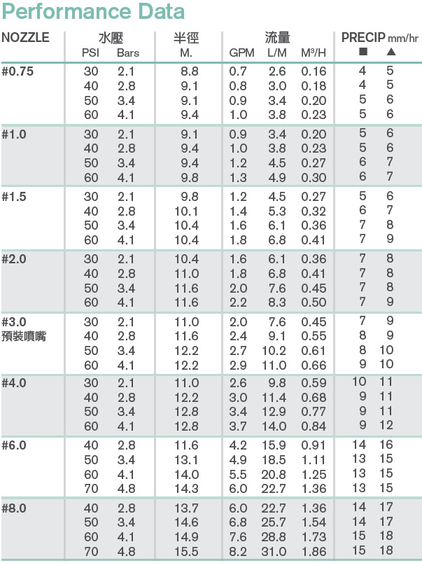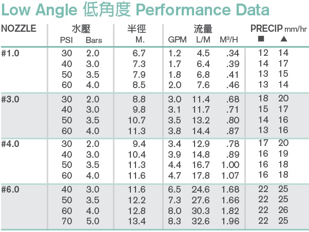 噴灑仰角:25度及低仰角11度(依據使用噴嘴規格)